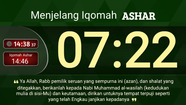 - Durasi tampilan, dapat diatur sesuai jeda iqomah yang diinginkan.