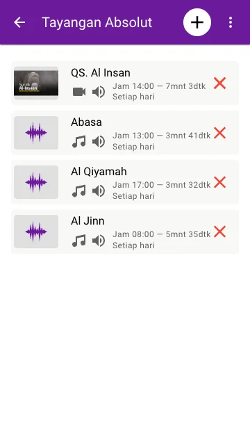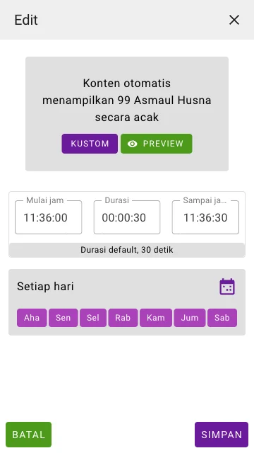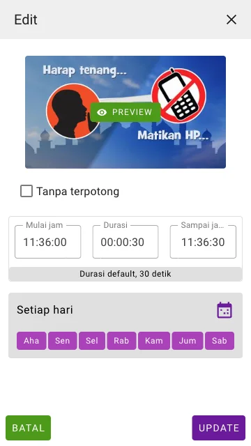 Tayangan ini terjadwal pada tanggal dan jam tertentu, atau hari dan jam tertentu, dan dapat ditentukan berapa lama durasinya atau jam berapa selesainya.