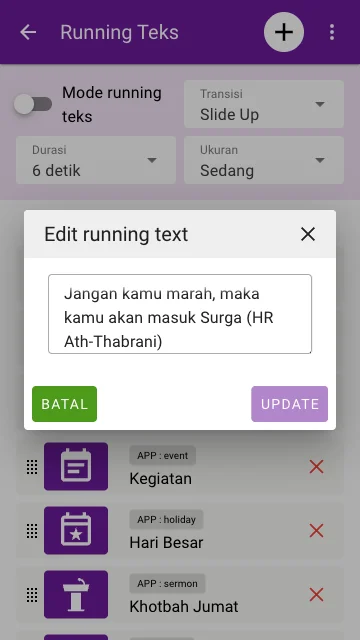 - Mode running text: Jika aktif, tulisan berjalan dari kanan ke kiri.