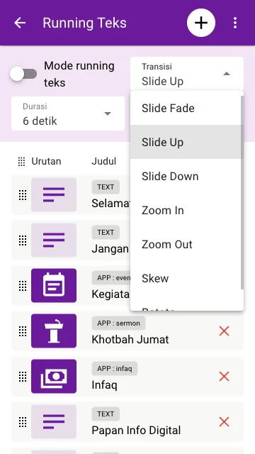 - Bisa diatur transisi (animasi antar teks) dan durasi tiap teks