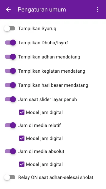 - Tampilkan Dhuha/Isyro': Jika diaktifkan syuruq akan disembunyikan dan sebaliknya.