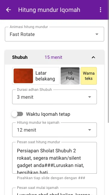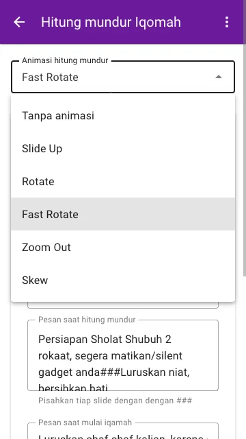 - Pesan saat mulai iqomah: Sesuai menu, teks ini akan muncul bersamaan dengan alarm iqomah.